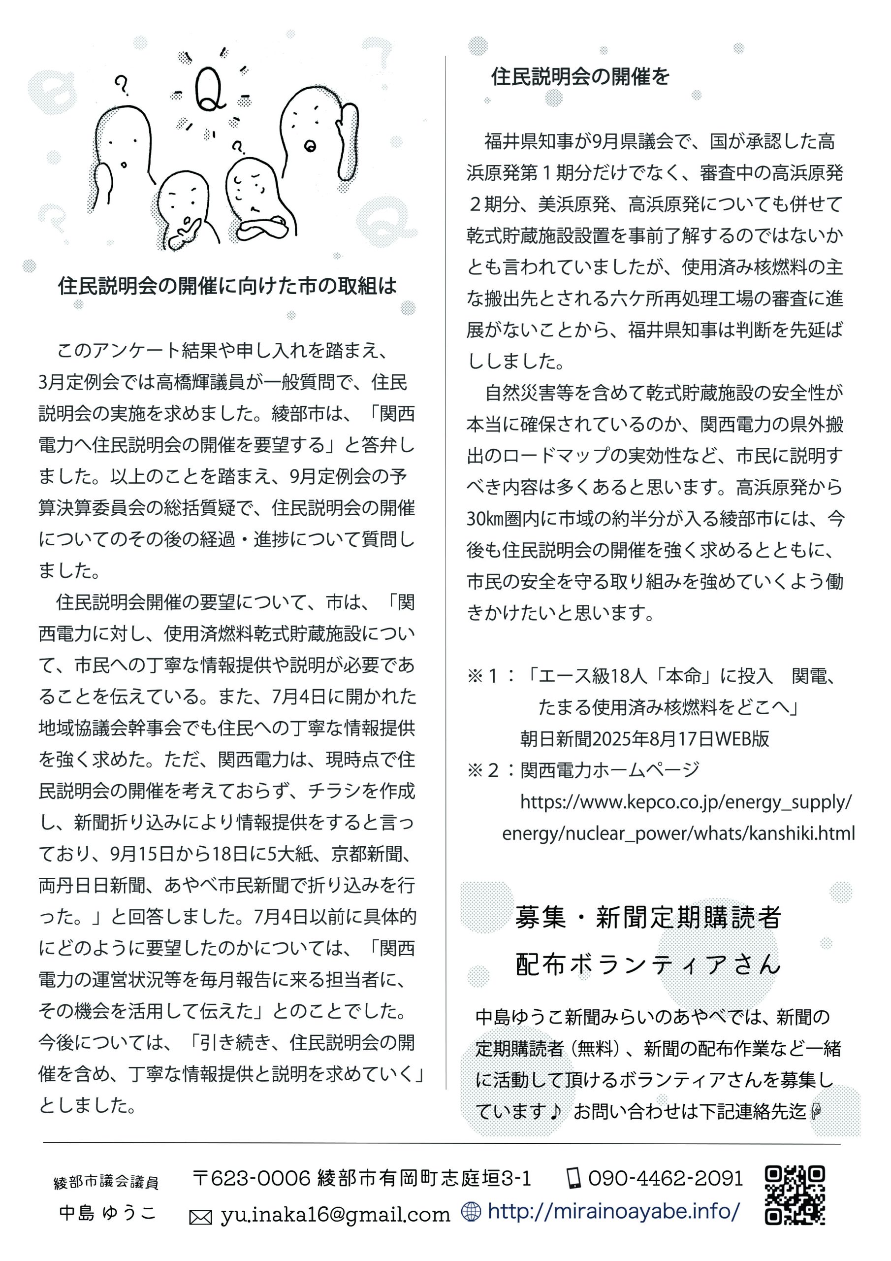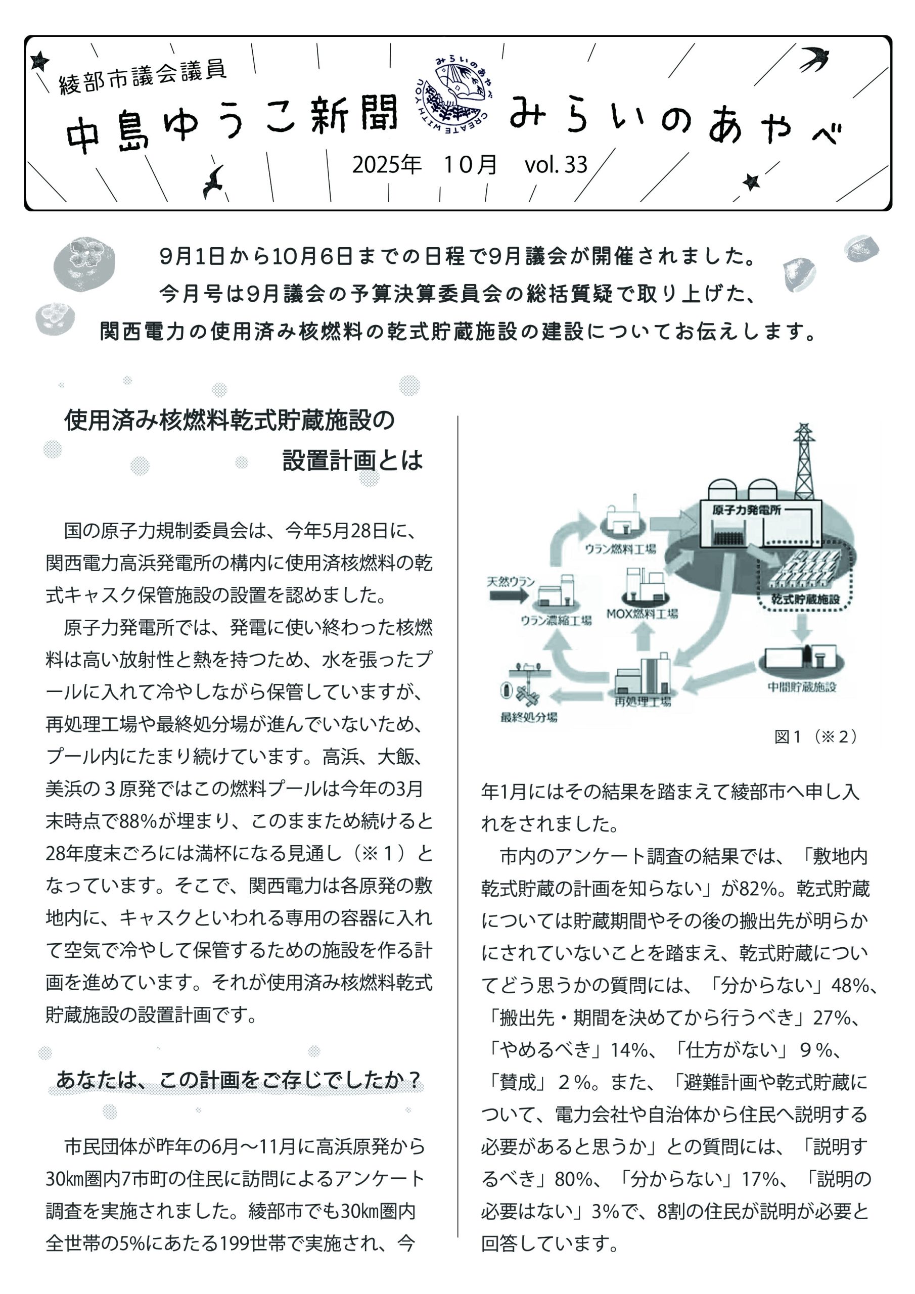 中島ゆうこ新聞 みらいのあやべ vol.33 2026年1月20日 最終更新日時 : 2026年1月20日 宮崎 達也 9月1日から10月6日までの日程で9月議会が開催されました。今月号は9月議会の予算決算委員会の総括質疑で取り上げた、関西電力の使用済み核燃料の乾式貯蔵施設の建設についてお伝えします。